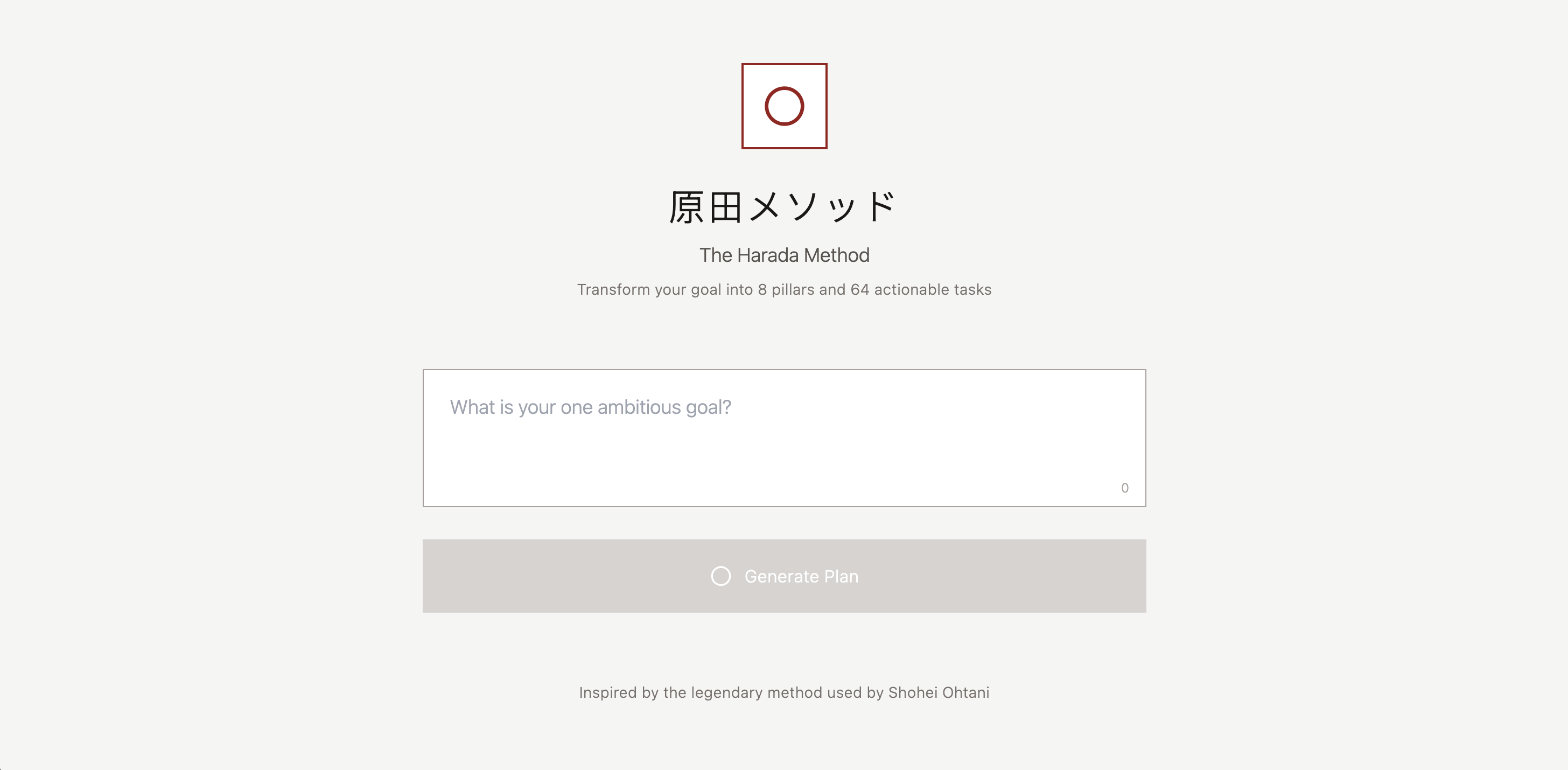 Below is the landing page. Pretty minimal. The "ๅ็ฐใกใฝใใ" directly translates to "Harada Method." What's left is to input any goal you have and hit the "Generate Plan" button.