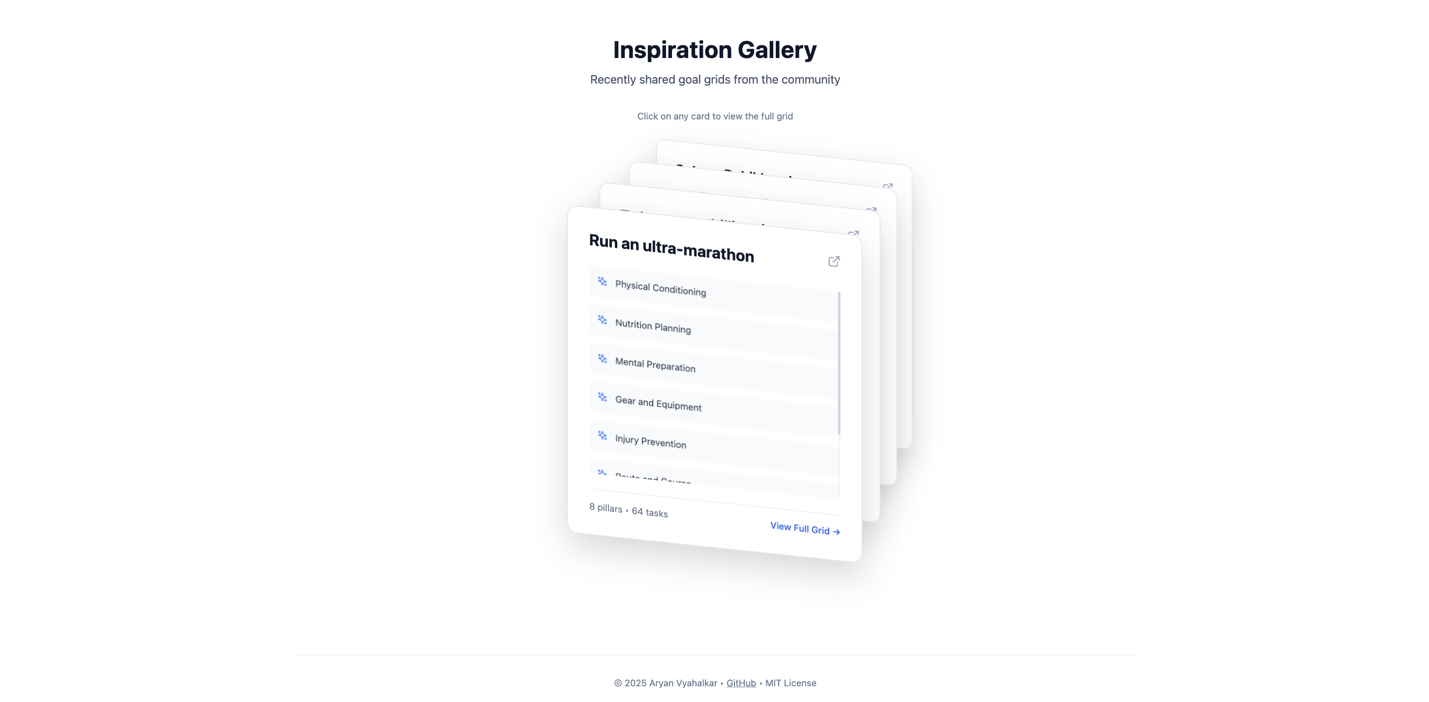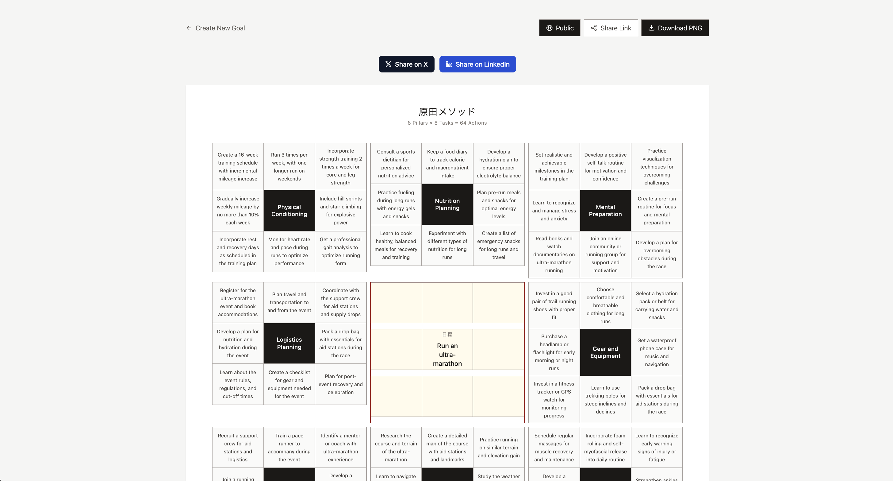The app takes any ambitious goal and structures it into an 8ร8 grid containing 8 supporting pillars, and within it, 64 actionable tasks.