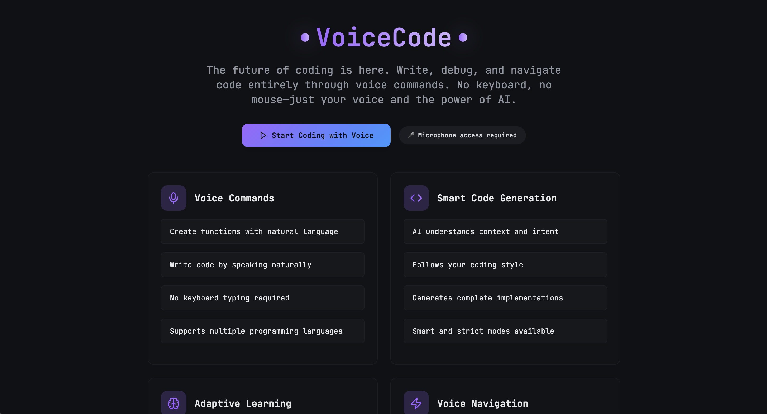 This is the landing page. Four feature cards (and example voice commands below it) that explain what the system does: voice commands for natural language input, smart code generation that understands context, adaptive learning that improves over time, and voice navigation to move through your codebase without clicking.