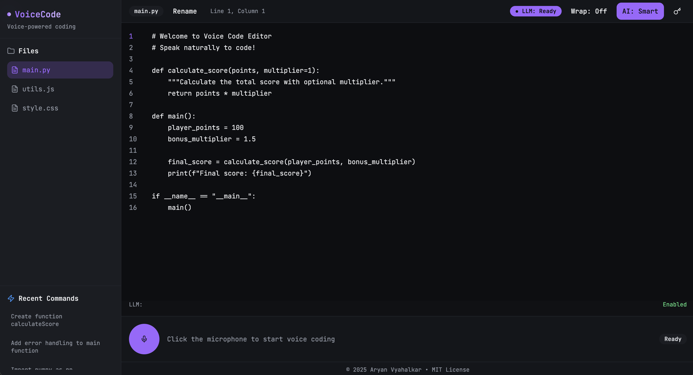 A voice-controlled code editor that lets you write and edit code without touching a keyboard. Speak your code, and it appears. Tell it to fix something, and it does.